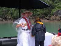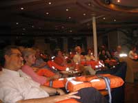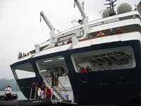 | Safety briefing .. | The Orion II .. | with zodiac launching platform. | Ready for the rain .. | ..and the tourist boat. |
