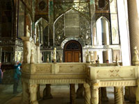 The exhibition of the Imperial Crown Jewels is situated inside the Central Bank of the Islamic Republic of Iran on Tehran's Ferdowsi Avenue. To enter you have to go through several security checks, until finally you enter what is literally a vault - past a massive steel vault door. The guide instructs you that you cannot even put your hand on any of the display cabinets without triggering the alarms and the automatic sealing of the vault doors.When you see the value of what is there, you can see why they have all these precautions.