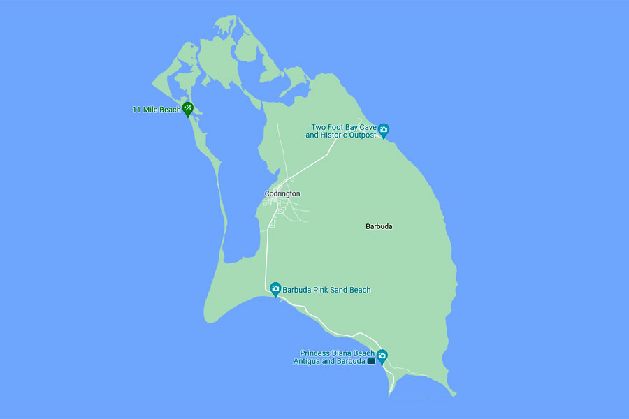 Barbuda makes up half the name of the country of Antigua and Barbuda, but it is smaller and less known than its partner island. Barbuda is a low limestone island with shallow lagoons, coral reefs and sandy beaches like reef-lined Spanish Point and North Beach. Some beaches have a slight pink hue. Barbuda was devastated by Hurricane Irma in 2017, with 95% of the buildings destroyed. All 1600 residents were evacuated to Antigua afterwards but returned to rebuild the only village on the island, Codrington.