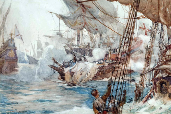 And the whole sea plunged and fell on the shot-shatter'd navy of Spain,
