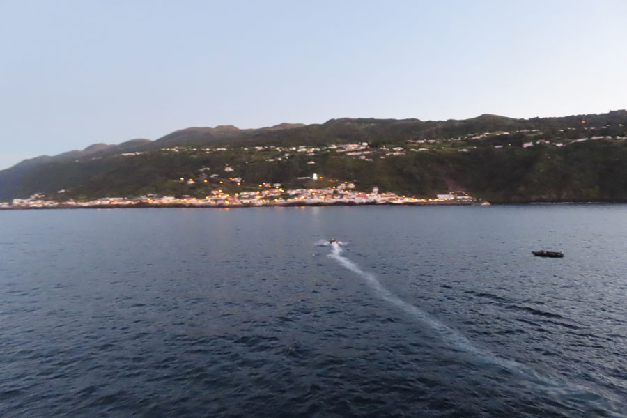 The island's economy was cheese/cows, there being far more of the latter than humans, 80000 of these. We stopped three times , twice overlooking the north coast. We boarded the zodiacs again in the main town of Velas to return to the Silver Cloud.. We watched the clouds roll over the island of Pico as the ship moved on to the island of Horta. But then a swell developed and after just one zodiac had been launched to take people ashore for whale watching, all operations were suspended for the day. So we missed the whale watching that we were booked on at Horta later in the day. But surprisingly, after I asked for another whale watching, Lea organised one for a few days later