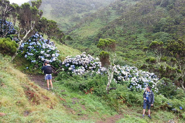 On São Jorge, the Flemish exported lichen and the plant woad to Europe for dye. Later, food, including oranges was cultivated for export. Yams were so important as a food crop for residents that they are on Calheta’s Coat-of-Arms. Its forests have native plants such as Azorean Candleberry Tree (Morella), Tree Heath, Pau-branco” (White Wood) and Azores Juniper. Alongside walking trails are colourful introduced plants, especially hydrangeas and yellow ginger-lilies. Seabirds, especially Cory's Shearwater, nest on higher slopes, although these are more easily seen from the ship.