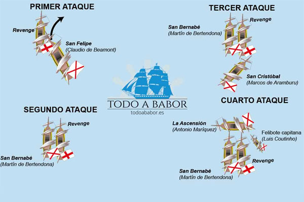 Shortly after Martín de Bertendona's San Bernabé did the same, this time successfully, and managed to rescue seven survivors of San Felipe's boarding party. San Bernabé's grappling was decisive to the fate of Revenge, because the English warship lost the advantage of her long-range naval guns. Conversely, the heavy musketry fire of the Spanish infantry forced the English gunners to abandon their post in order to repulse the attack. At dusk, having dispersed the bulk of the English fleet, San Cristobal rammed Revenge underneath its aftcastle, putting on board of the English ship a second boarding party which captured her colours. The Spanish soldiers got as far forward as the mainmast before being forced to retreat, due to heavy musketry fire from the aftcastle.