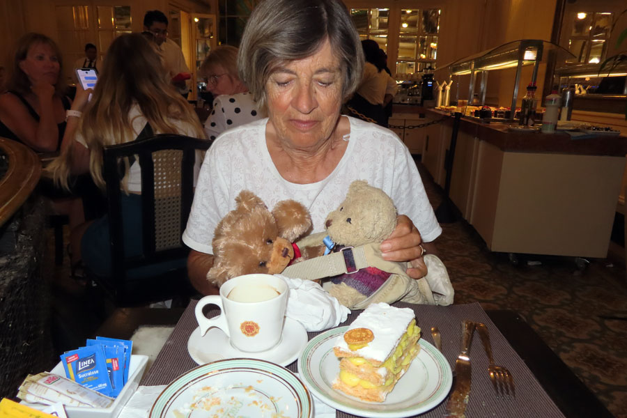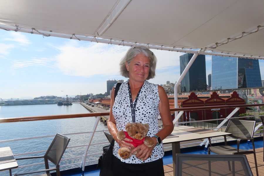 And .... Chris got Silverseas Bear from Jonathan as her ’ very disappointing’ prize from Trivia points. Silversea Bear came out of of a cupboard in the Panorama lounge, where we suspect he had been lurking/hiding for several years