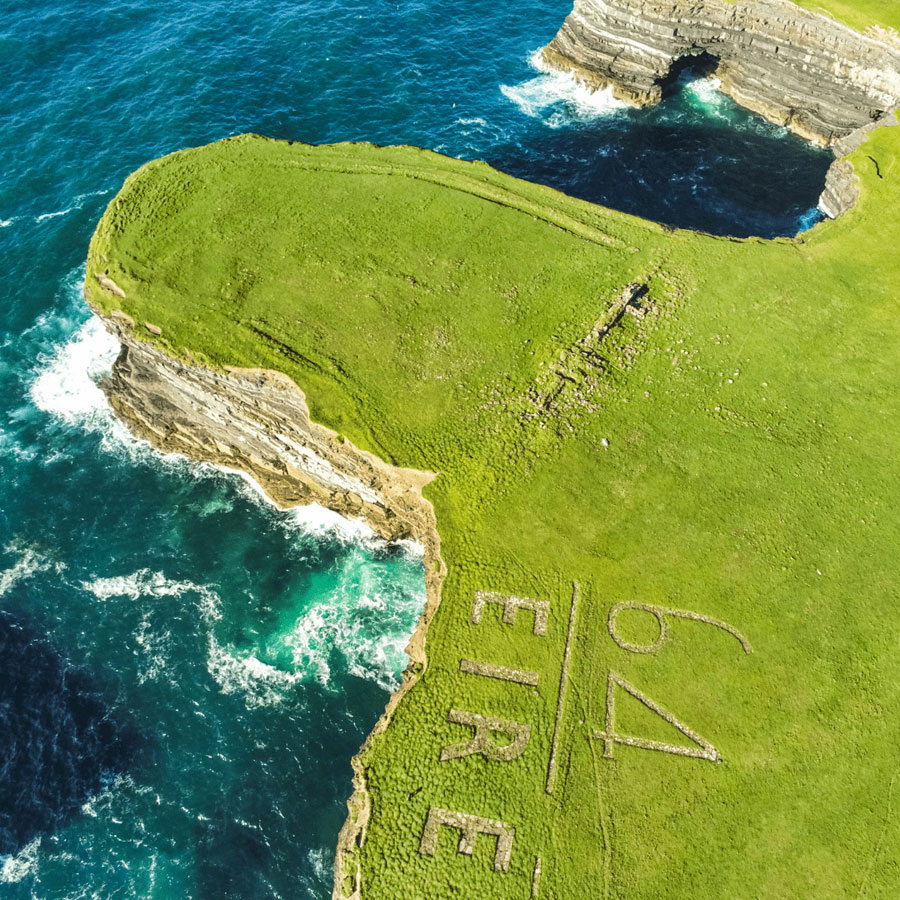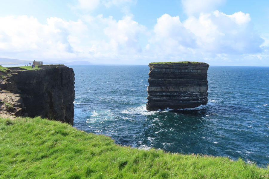 From DownPatrick Head the most fantastic view is of 'Dun Briste'. Dun Briste, (in English 'The Broken Fort'), is a sea stack close to the edge of the cliffs, which is 63 metres by 23 metres, 45 metres high and 228 metres from shore. In 1393 it was separated from the coast as a result of high seas and violent stormy weather. Old annuals said people who lived there were taken off using ships ropes.
