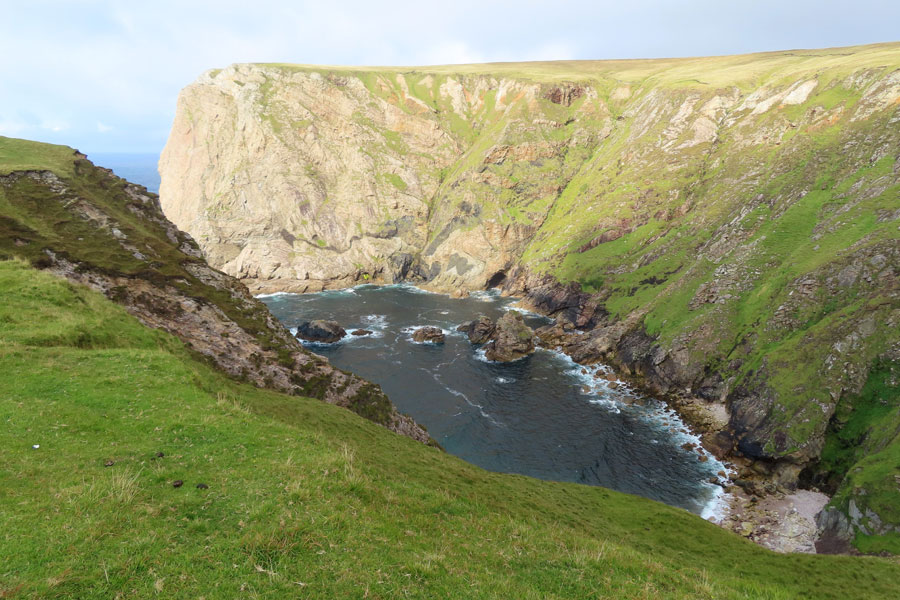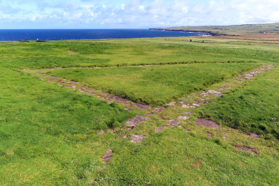 On July 31st 1980, Dr. Seamus Caulfield, his father Patrick Caulfield and Martin Downes, Professor of Biology at Maynooth College, landed by helicopter on Dún Briste and discovered the ruins of two stone buildings and an interesting low opening which is supposed to allow sheep to pass from one field to another. Similar openings can be found in many places all around Mayo. They also examined the fragile plant life on the stack's top.