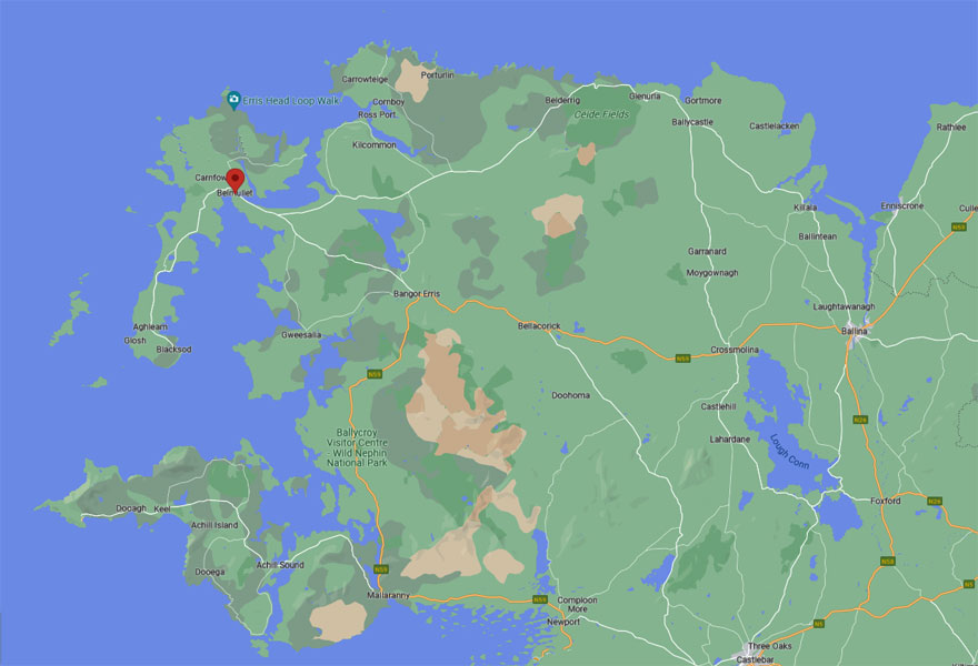 Belmullet (meaning 'mouth of the Mullet Peninsula' is a coastal Gaeltacht town with a population of 1,019. According to the 2016 census 50% of people in the town were able to speak Irish while only 4% spoke it on a daily basis. The area plays host in summer months to students enrolled in local Irish language summer schools.