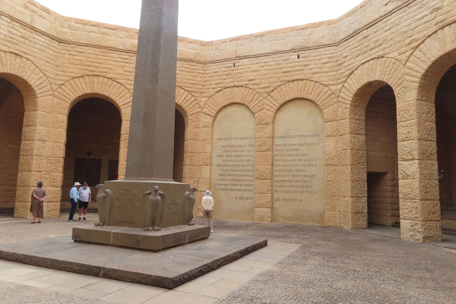 El Alamein German War Cemetery was built in the shape of a fortress. It contains 4,213 German burials from the Second and 30 from the First World War. There are also 31 casualties with an unknown nationality buried here. Inside the war memorial, each side of the octagonal courtyard houses an alcove, with symbolic remains of some German soldiers. The medieval looking Teutonic stronghold stands on a ridge between the Allied and Italian cemeteries. It took three years to construct and was inaugurated in 1959. The German memorial is the creation of Robert Tischler, principal architect of the German War Graves . In Alamein, Tischler wanted to evoke Ancient Egyptian architects who were considered world masters when it comes to honouring the illustrious dead. Hence the 11.5 meter high basalt obelisk supported by four falcons purposefully located in the centre of the mausoleum's inner courtyard. On the German memorial's plates and mosaic panels, which hang in covered alcoves and burial chambers, are engraved the names of approximately 4,200 German soldiers. Just like the Allied mausoleums, the expanse of land on which the German mausoleum stands was offered to the German government by the people of Egypt.