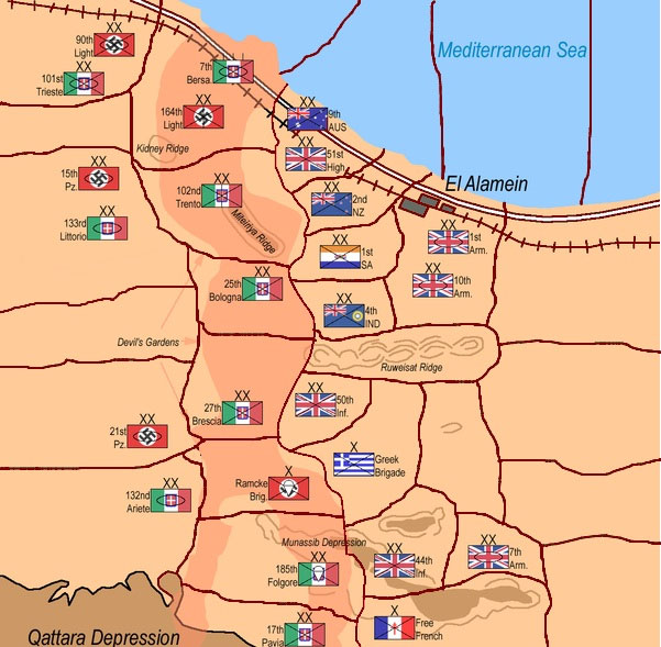 The campaign in the Western Desert was fought between the Commonwealth forces (with, later, the addition of two brigades of Free French and one each of Polish and Greek troops) all based in Egypt, and the Axis forces (German and Italian) based in Libya. The battlefield, across which the fighting surged back and forth between 1940 and 1942, was the 1,000 kilometres of desert between Alexandria in Egypt and Benghazi in Libya. It was a campaign of manoeuvre and movement, the objectives being the control of the Mediterranean, the link with the east through the Suez Canal, the Middle East oil supplies and the supply route to Russia through Persia.
