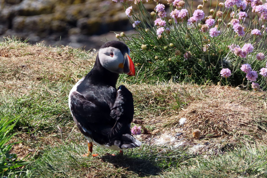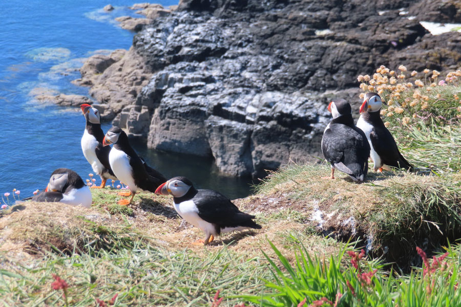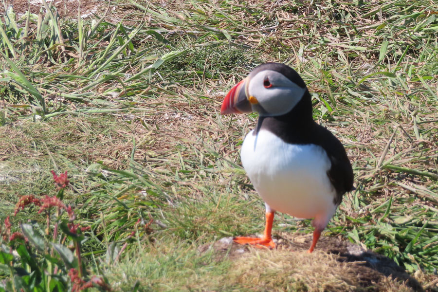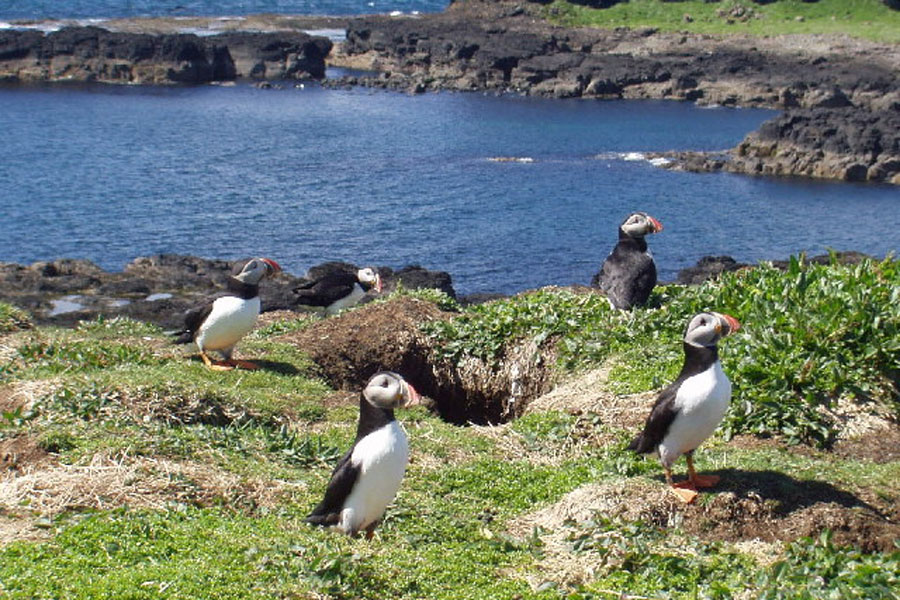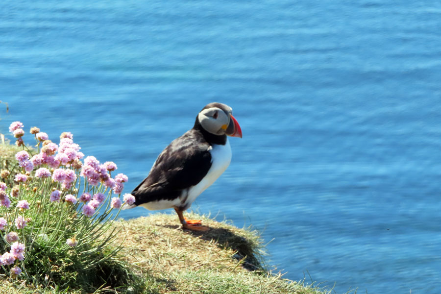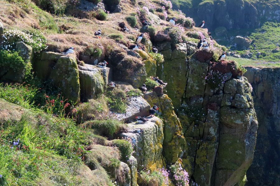 Abundant plant life and exotic birdlife are now the main inhabitants of the area. Fortunate visitors view the magnificent array of birds, especially the great puffins that breed on the islands plateau. One can sit within just a few feet away without disturbing the avian ambassador’s peace. The 81 hectare island is home to many rare and endangered plants such as, primroses and orchids. Views over the landscape and across the ocean can be seen from the 300 foot high cliffs.
