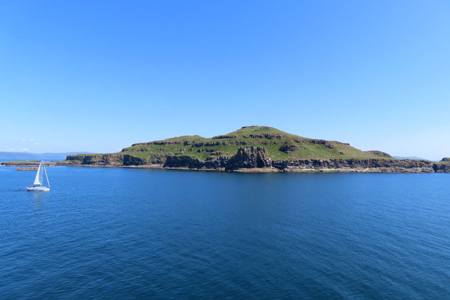 The stunning Isle of Lunga is the largest island in the Treshnish archipelago. Of volcanic origin, Lunga has been described as 'a green jewel in a peacock sea'. Lunga still bears the remains of blackhouses. The highest recorded number was 29 in 1794, declining to 15 by 1891 and only 5 by 1931. It is difficult to say exactly when the Lunga village was abandoned. Fraser Darling stated in 1940 that the villagers left “eighty years ago”, and H. Haswell-Smith, in “The Scottish Islands” says that “year-round occupation ended in1824” when one Donald Campbell and his dependents left, but regular summer occupation continued until 1857. The graves of some of the islanders are to be found in the churchyard at Kilchattan on nearby Luing. To the northeast of the island lie the remains of the ruined village, which was abandoned in 1857.