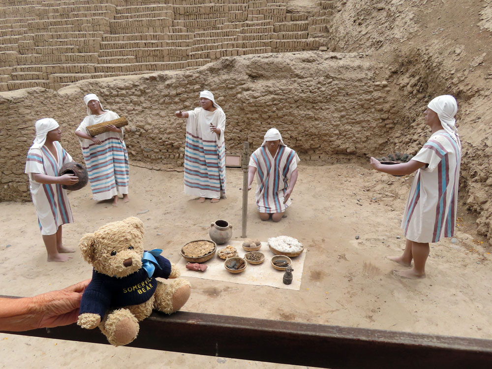 We then drove to Miraflores and the private site of Huaca Pucllana . This was much more impressive being a temple built of millions of Adobe bricks around 100 A.D. the other site had been modern and was of 1100 A.D. so we enjoyed the second site but we’re not allowed to wander off by ourselves at all. Huaca Pucllana is a great adobe and clay pyramid located in the Miraflores district of central Lima, built from seven staggered platforms. It served as an important ceremonial and administrative center for the advancement of the Lima Culture, a society which developed in the Peruvian Central Coast between the years of 200 AD and 700 AD.