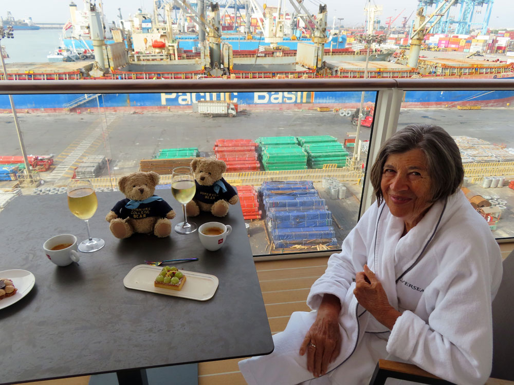 Then back to the ship for lunch in the Marquee where we had a pizza for the first time. Back down to the suite and some serious packing for an hour or so. Then I went for a swim and we enjoyed coffee and a cake on our balcony watching the containers being lifted off the rusty ship beside us. On the other side of us was the ship from Belfast. Villa Vie Residences, that was doing a world cruise with people buying apartments on it for the three years. They had been stranded in Belfast for some 5 months, while the engine was repaired.