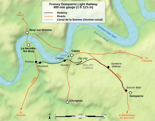 The Froissy Dompierre Light Railway (French: Chemin de fer Froissy-Dompierre, CFCD) is a 600 mm (1 ft 11+5⁄8 in) narrow gauge light railway running from Froissy (a hamlet of La Neuville-lès-Bray) to Dompierre-Becquincourt, through Cappy, in the Somme department, France. It is run as a heritage railway by APPEVA (Association Picarde pour la Préservation et l'Entretien des Véhicules Anciens) and is also known as P'tit Train de la Haute Somme. It is the last survivor of the 600 mm (1 ft 11+5⁄8 in) narrow gauge trench railways of the World War I battlefields.