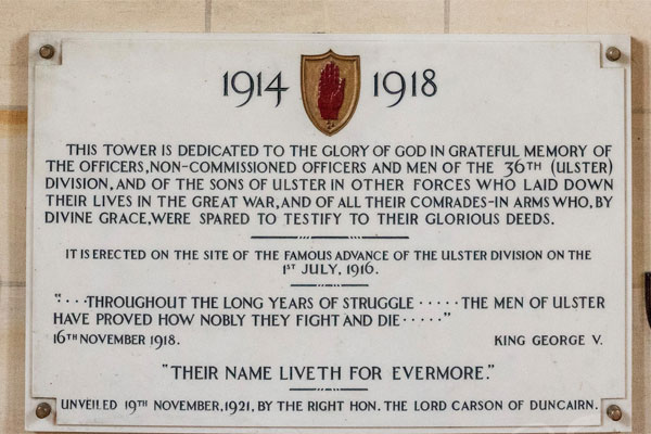 To their left, the 108th Brigade were successful in advancing near Thiepval, but less so nearer the River Ancre. The 107th Brigade supported them, but although men of the 36th Division held out for the day the Germans mounted counterattacks, and as their stocks of bombs and ammunition dwindled, many fell back with small parties remaining in the German front lines. The casualties suffered by the 36th Division on 1 July totalled over 5,000. Memorial At the entrance to the tower is a plaque commemorating the names of the nine men of the Division who won the Victoria Cross during the Somme.