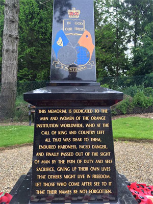 There is also a memorial here commemorating the part played by members of the Orange Order during the battle. The inscription on this memorial reads: "This Memorial is Dedicated to the Men and Women of the Orange Institution Worldwide, who at the call of King and country, left all that was dear to them, endured hardness, faced danger, and finally passed out of the sight of man by the path of duty and self sacrifice, giving up their own lives that others might live in Freedom. Let those who come after see to it that their names be not forgotten."