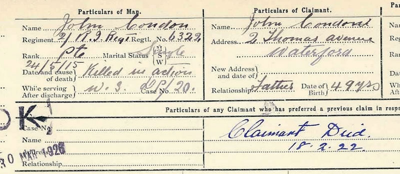 - The same stamping could denote 6322 Rifleman Patrick Fitzsimmons, 2nd Bn. Royal Irish Rifles, KIA 16 June 1915, who previously was in the 4th battalion Royal Irish Rifles.