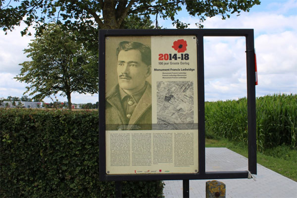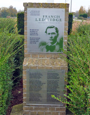 On the 81st anniversary of his death in 1998 a simple non-militaristic monument was unveiled by the poet's nephew, Joe Ledwidge, and the writer Dermot Bolger, on the exact spot where he was killed - the location having been unearthed by Piet Chielens, the director of the In Flanders Fields Museum. The monument consists of a portrait of Ledwidge on glass over yellow Ieper brick, with the text of his poem "Soliloquy" printed in English and in Dutch