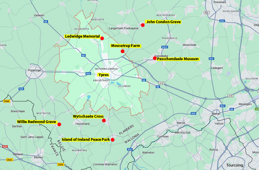 The memorial cross is situated next to the entrance to Wytschaete Military Cemetery. This is located seven kilometres south of Ieper town centre, on a road leading from the Rijselseweg N365, which connects Ieper to Wijtschate (Wytschaete) and on to Armentières. On arriving in the village turn into the main square following the signs for Kemmel. The cemetery and cross are on your right.