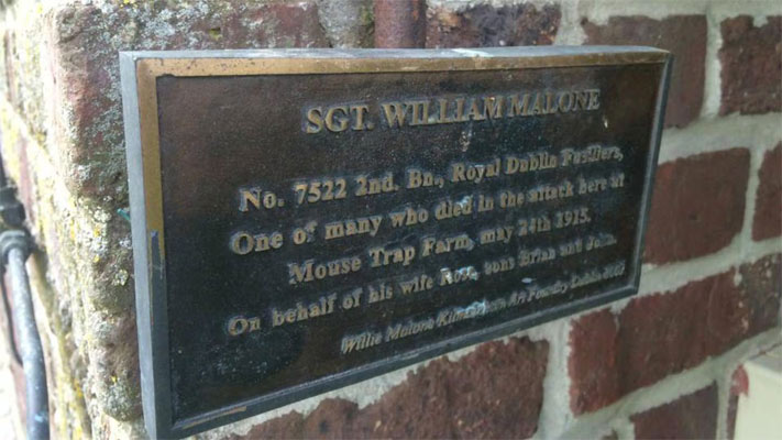 On the gable wall of the farm are two plaques. One, recently put there, remembers Pte William Byrne (19) from Blackrock, Co Dublin, who died on May 24th. The other is a bronze plaque to Sgt William Malone (36) from the South Circular Road. It was put there 10 years ago by his grandson, a bronze sculptor also called William Malone. Sgt Malone was a brother of Lieut Michael Malone, the republican hero of Mount Street Bridge. During Easter Week 1916 he inflicted terrible casualties on the Sherwood Foresters from a house in Northumberland Road before being killed.