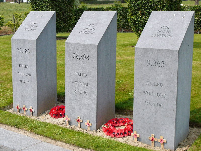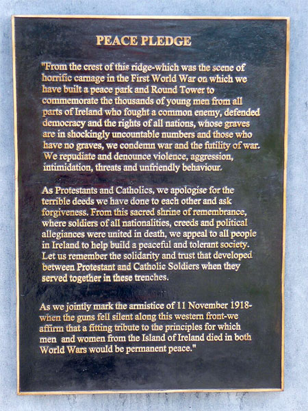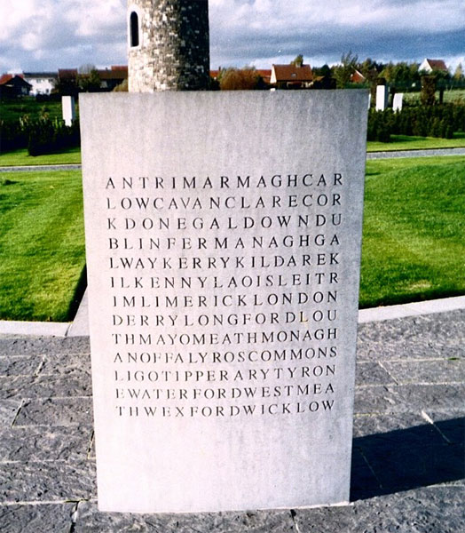 The Irish government became involved in part funding the project together with the Northern Ireland Office. Statutory and private bodies rolled in behind the project and within two years of the initiation of the JRT the Island of Ireland Peace Park and Celtic Round tower was complete. It was formally opened by the Irish President Mary McAleese who, in the presence of Queen Elizabeth of the United Kingdom and King Albert of Belgium, led the wreath-laying ceremony in the afternoon of 11 November 1998. It was the first time an Irish State officially acknowledged the soldiers from Ireland who died in WW1. This was also a seminal moment in Irish history when an Irish Head of State and a British Monarch met publicly in a joint ceremony. The Park is maintained by the Commonwealth War Graves Commission on behalf of the Office of Public Works in Ireland. Prior to the Island of Ireland Peace Park, no Irish government dignitary had ever attended any WW1 Remembrance Service either in Ireland or at the Menin Gate. At an official ceremony on 11 November 1998 the Irish President apologised on behalf of the Republic of Ireland to the families of the fallen for what she called the 'national amnesia' in remembering the soldiers of WW1 from the Island of Ireland.