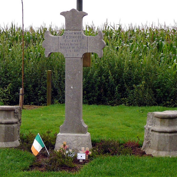 Major W H K Redmond, 6/Royal Irish Regiment. Killed in action 7 June 1916.Buried near Locre (now Loker) Hospice Cemetery. Grave: Stone cross 50m W of the Cemetery.