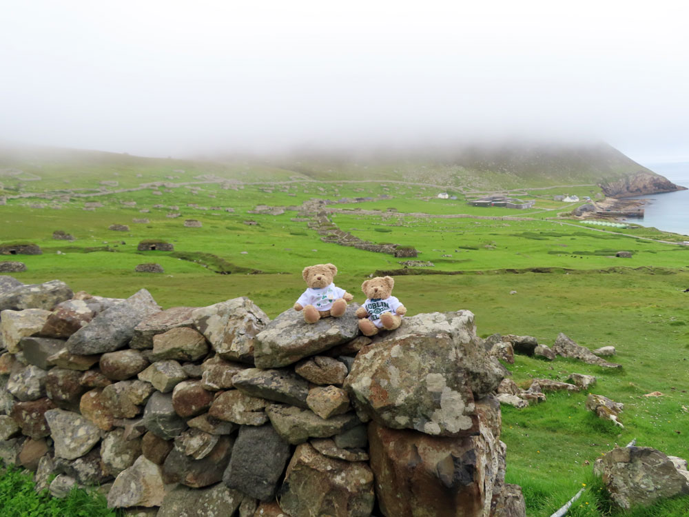 We had the earliest breakfast possible in the restaurant and then went by Zodiac to land on Saint Kilda around 8:30 am. There were two organised hikes but we had got permission from Werner to go off by ourselves. The island was covered by low cloud and we walked past the buildings of the Ministry of Defence and up the road until we were well into the clouds. Then we decided it was futile continuing further and retraced our steps down out of the cloud. We then with a little difficulty cut across country to get to the end of the row of cottages on the old main street of St Kilda: This involved crossing a stream which I managed successfully. We visited the graveyard and the museum house and then walked on to the gun which have been installed at the end of World War I. Then back to the church and schoolhouse which were pleasantly empty.