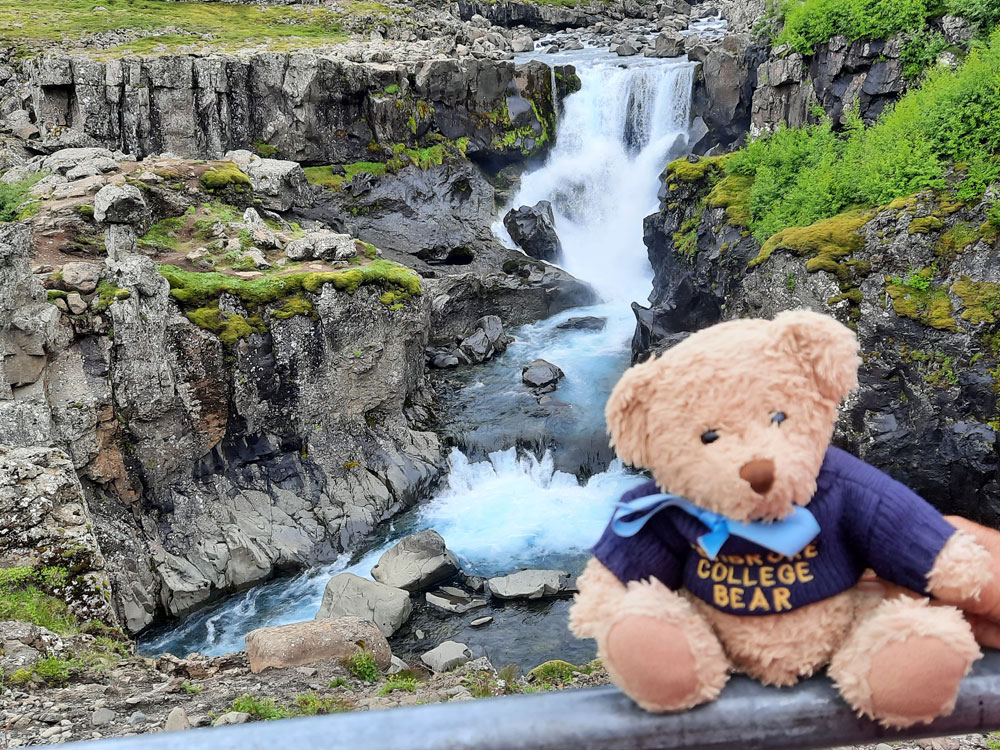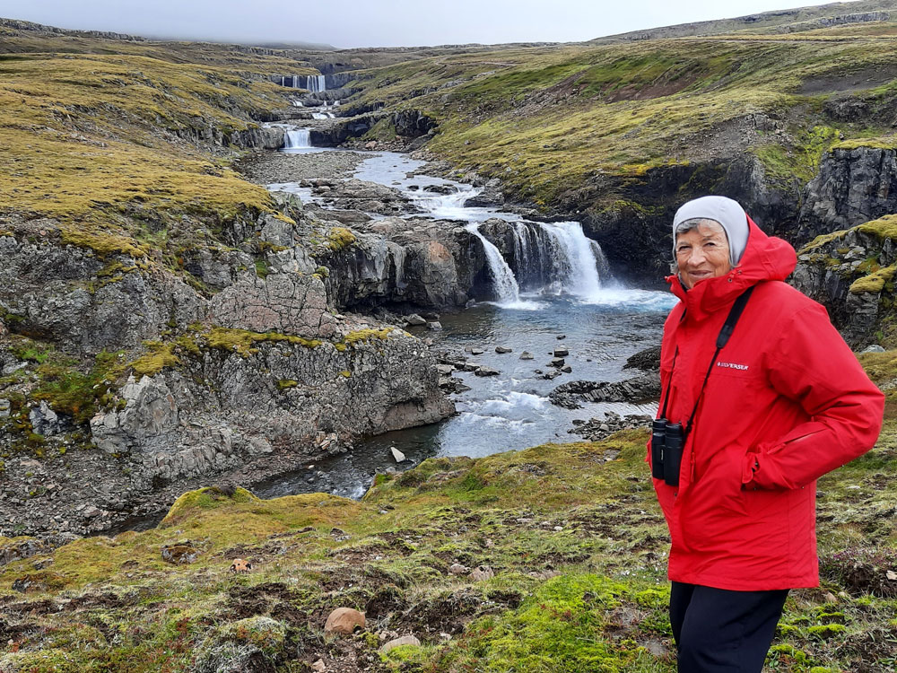 So into lunch at 12 noon prompt, out by 12.45, and down for a zodiac for our one p.m. super Jeep excursion. Super Jeeps are an Icelandic specialty in which locals spend large amounts of money in getting their car customised with enormous wheels. We were in a jeep with seven other people, but David had the front seat and was able to enjoy good chats with the informative driver. We wandered up a valley with the eight jeeps stopping several times to look at waterfalls and abandoned farm buildings with a history of the prolific family that lived there from 1922 until 1944. We eventually stopped on the way back for some coffee and very good home baked chocolate cake.