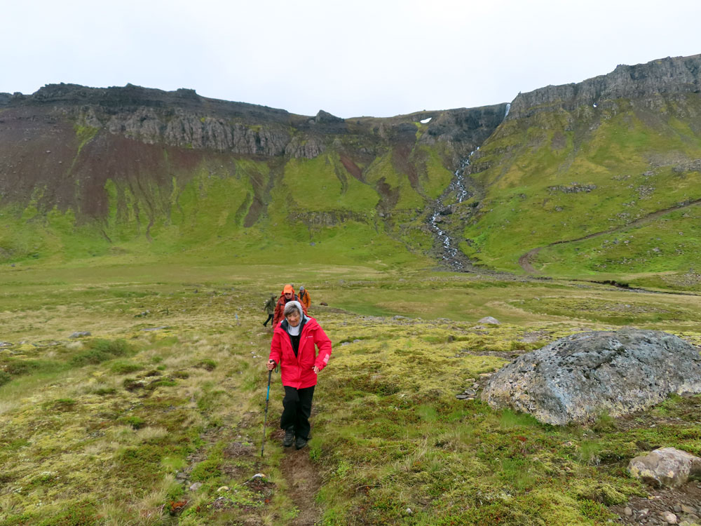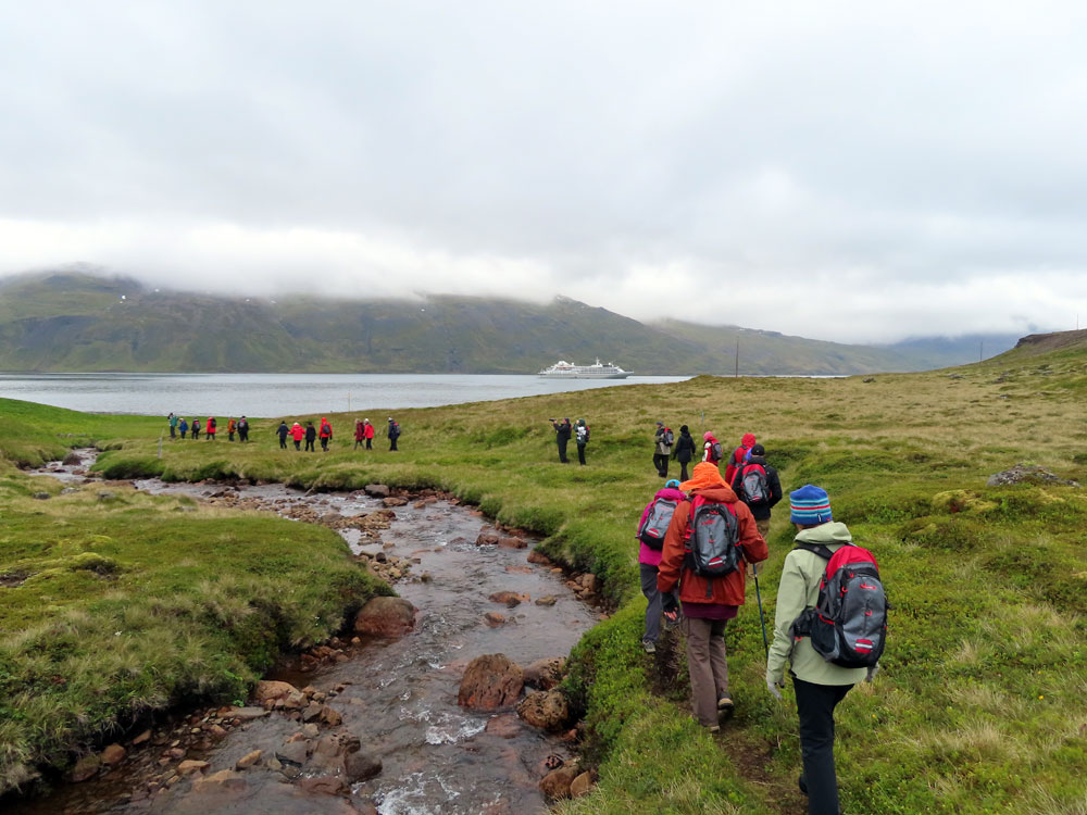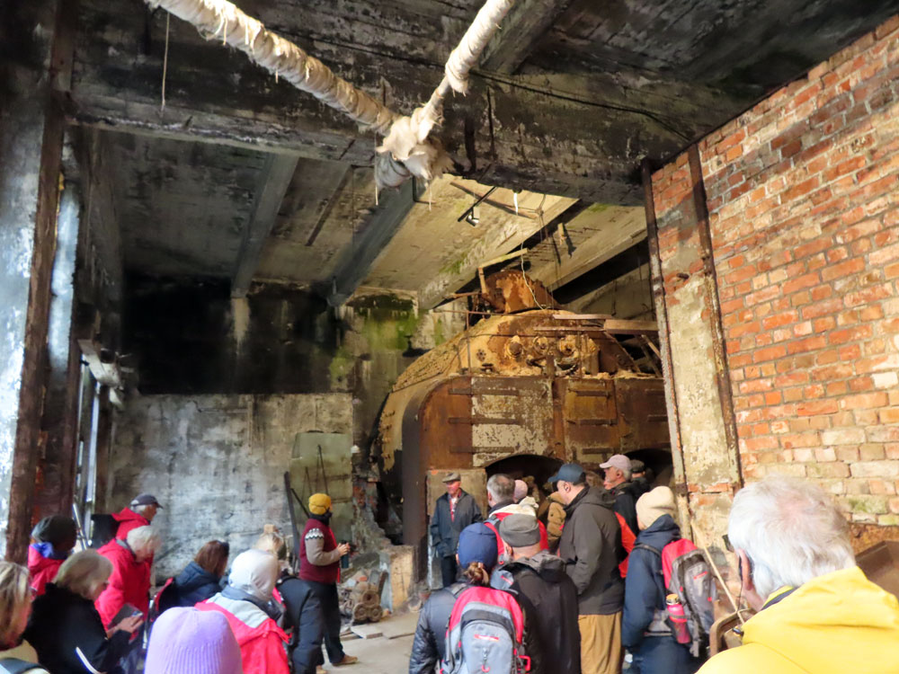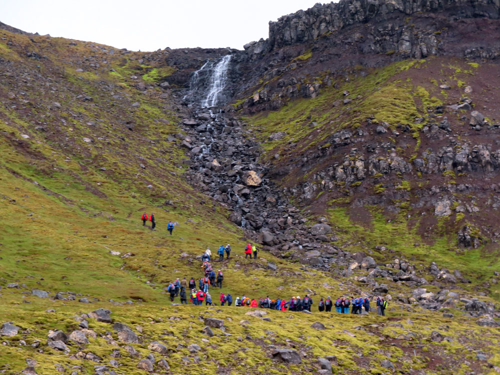 We had an early breakfast and disembarked for the medium hike at 8:15 am. This was led by Malcolm and had about 30 people in it and consisted in going over grassy and uneven land for the first 2/3 and finally back along the edge on the road to the herring factory.