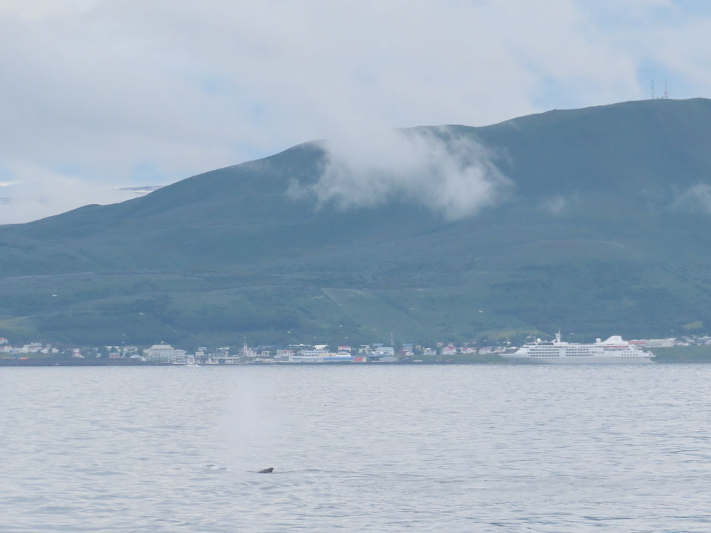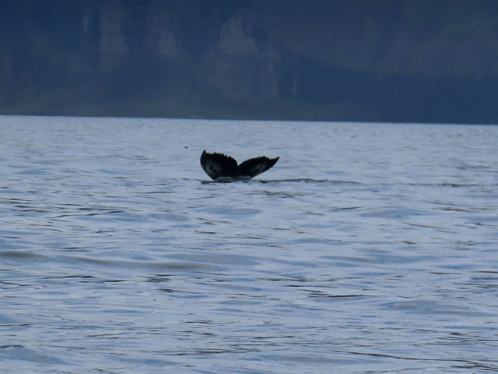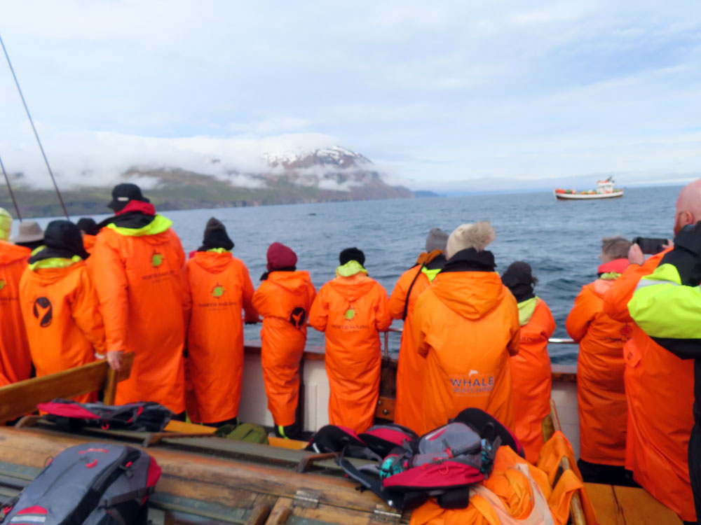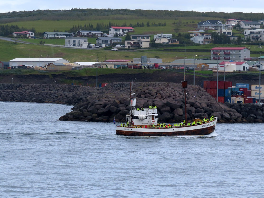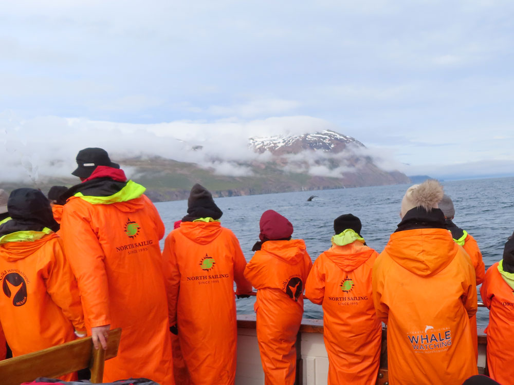 We went off at 8:15 am for a whale watching tour. Once ashore it was a 10 minute walk to a different part of the harbour to find our vessel and here we were kept waiting for 15 minutes or so in the light rain. Once the 80 of us were aboard this whale boat, we were provided with dry suits to keep us warm and then a southwesters which meant that we could hardly walk, we were so bulky. Several whales were sighted and people in general seemed contented with the tour.