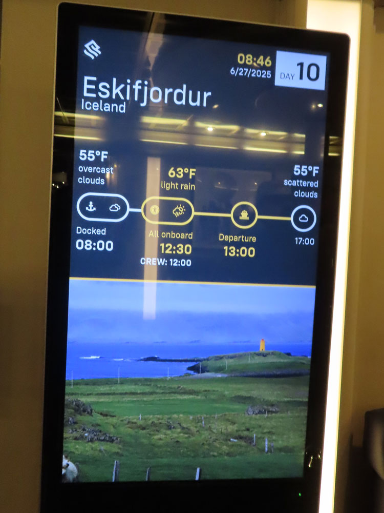 Later on the ships, officers appeared in the panorama lounge for drinks and caviar were served. No treat to either of us but we had a nice chat with the hotel director and then a very short one with the captain. We dined in the Terrassa and then went back to the Panorama Lounge to see how the bingo, which has appeared on the daily schedule, would be conducted. This after an assurance from Conrad that that would be no bingo aboard an expedition ship ever again. But it turned out that this must have been sanctioned by Silversea as there was a television screen with it on. There were probably 30 to 40 people playing it and it seemed remarkably stupid to us.