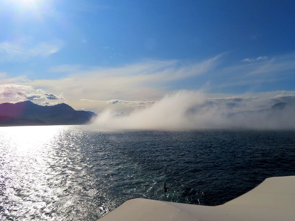 We enjoyed cocktail and canopy outside of the panorama lounge in brilliant sunshine but then a thick fog came in , and we had to withdraw inside.