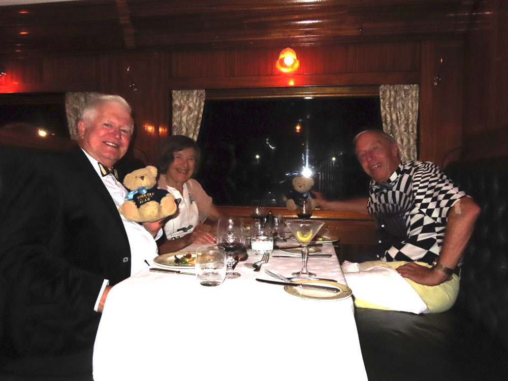 At 4 pm, we went for another talk by Nicholas supplemented by Tim on the number of deaths and disappearances of Congo and Angolan leaders. After this we sat until sundown in the middle observation car before returning to the cabin and getting very frustrated because there was no laundry list and this took ages to arrive and then Vivian thought it was all our fault that we had not got the laundry in on time and that we had no laundry or pressing list: quite fantastic that they have staff like this! Anyway, when we had sorted out the laundry with them went to the middle lounge for a nightly margarita and chatted to John and Carol Charlie (yes, that was their surname) and Glenda. Then we had dinner with Nicholas and this was really an interesting evening.