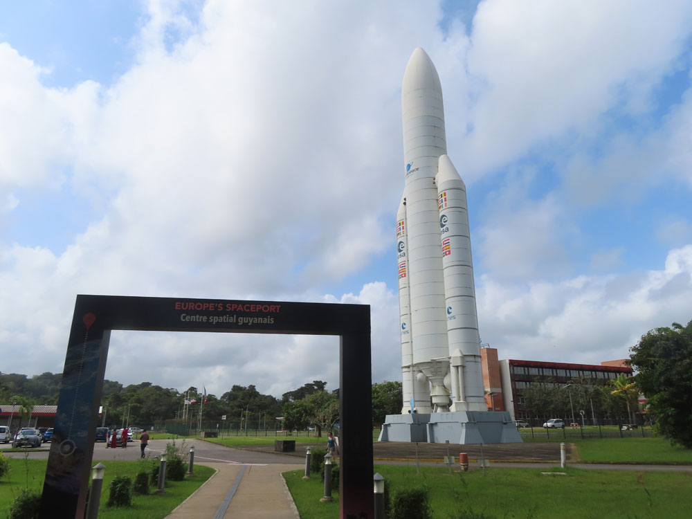After this we drove to Kourou where the launch was due to take place at 13:45. We got there about 13.15 and were ushered into a café for lunch which left me disappointed as it was full of buffet hot plates and I had visions of a sophisticated French patisserie. Anyway once we put the food on our plate, we took the plate to some scales where it was weighed for charging - a novel occurrence for us