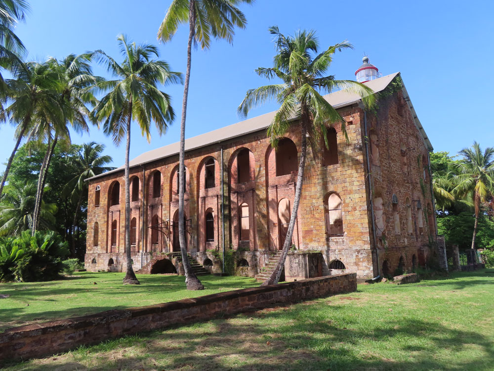 So at 1:10 pm we had to abandon the restaurant area and beat our way back to the boat. We were the last to board it. Then a short traverse to Saint Joseph's Island where the catamaran anchored and we were then transferred to shore by a very small zodiac which only took four passengers and two crew. It therefore took 6 trips to get us all ashore. Once ashore we did a 45 minute tour round 3/4 of the island and up to the top where the main prison was located. Very few of the convicts sent here ever managed to make it back to France.