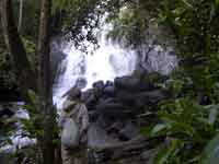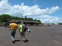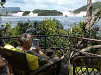 Our first afternoon had a trip by canoe to get behind the falls fronting the Waku Lodge. Not realising how bad the water force was, I rather stupidly took the manager's suggestion to wrap my camera in a plastic bag , and take it with me to get the "iconic shot" behind the waterfall. Turned out the shot was not worth getting, and my camera got wet - I thought at the time irreparably, but in the event it did dry out, and I was able to download the last three weeks photos. Chris eschewed, wisely, the walk behind the two falls - there was no actual path, and one waded knee deep in potholes in the water. My misery was compounded in that we were part of a group of 10 on the excursion - the other 8 were all Chinese, and were a very juvenile bunch who whooped and shouted, and stopped everywhere for numerous photos of themselves, taken holding heroic poses against the backdrop of whatever was around. Not a good afternoon. Happily I managed to rescue the photos when I got home, so the memory is more irritation against the Chinese, rather than grief at losing all my holiday photos. But it did mean that I did not take what I thought was a non functioning camera on our trip to the Falls!