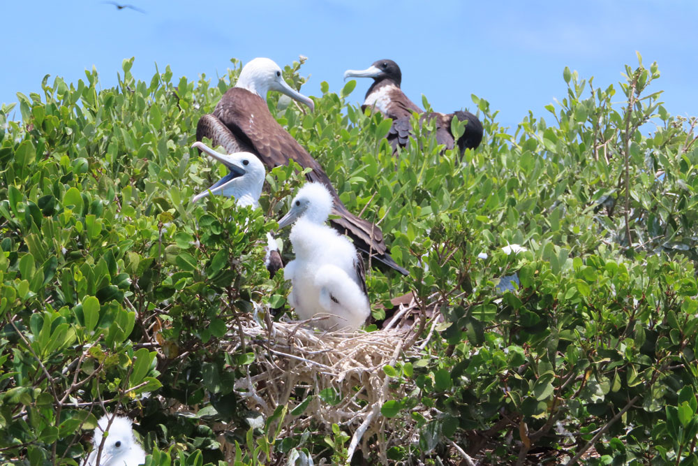 The Caribbean may be known for its pirates but the most elegant and effective pirates at Barbuda are the Magnificent Frigatebirds. These large long-winged fork-tailed birds harass other flying seabirds until they regurgitate recently caught fish. The frigatebirds then snatch a free meal in an act of ‘aerial piracy’. "You can visit the nesting colony in the Magnificent Frigate Sanctuary at Codrington Lagoon, which boast the largest nesting colony (with an estimated 2500 birds) in the western hemisphere .These magnificent birds travel between the Caribbean and Galapagos islands during the varying mating seasons. You may see males on low mangroves inflating red balloon-like throat pouches to attract females"; but we were not there in mating season!!.