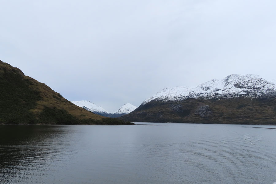 We had an early breakfast and boarded a coach before 08.00 to take us to the "Train at the End of the World " There was a stop en route at a scenic beach. And 30 minutes after that we were in the National Park admiring the snow covered peaks . Soon we boarded the old steam train. There had been a prison in Ushuaia since about 1900 and the prisoners had first built this line and then used it daily to get out to collect firewood and bring it back to town to the Electricity station.