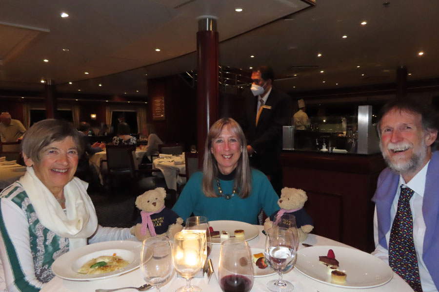 Chris had a jacuzzi and a sauna before afternoon tea and Trivia. Then a lecture by Damon on Chile.. The Captain's Welcome was at 7.30 where we got talking to Christine & Ian (also clients of Carmen), we then had dinner with them. Captain Freddy, of Finding the Endurance fame, introduced his officers, There was a "technical stop" at Puerto Williams in the early evening, to clear the ship out of Chile - it just anchored offshore and the officials came on board - so it did not impinge on us at all. By 10 pm we were ready for bed!