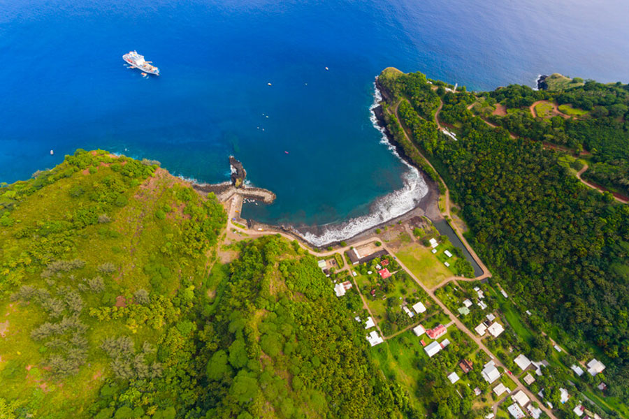 Ridges and cliffs form the beautiful, rocky Fatu Hiva, the southernmost of the Marquesas Islands in French Polynesia. The half-moon-shaped Omoa Bay encircles the village of Omoa, where about 250 people reside near the island’s main church. They make tapa cloth in a traditional way with beaten bark decorated in inked traditional Polynesian designs. The island is covered in lush jungle vegetation that is divided in some places by narrow ravines marked by sharply dropping cliffs. The ruggedly beautiful Bay of the Virgins, appears as if its palm tree-lined, jutting rocky ridges were carved by some great hand into stone sculptures