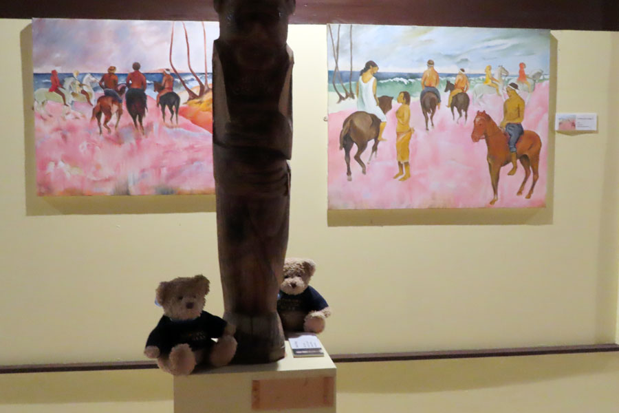 Had to wait for transport- meant to be 8 cars or but turned out to be 4 cars - to take us to the cemetery. Luckily no welcome dance. Having seen Gauguin and Brel's graves , we walked down to the Gauguin museum where there was absolute chaos as the admission lady would not believe that the ship was paying . Dmitri was the responsible crew member, and seemed quite baffled by what was happening, and he was not able to solve it. Many guests paid themselves, rather than wait for a solution - we waited ! And we were eventually allowed in and enjoyed looking at reproductions of all Gauguin's paintings.