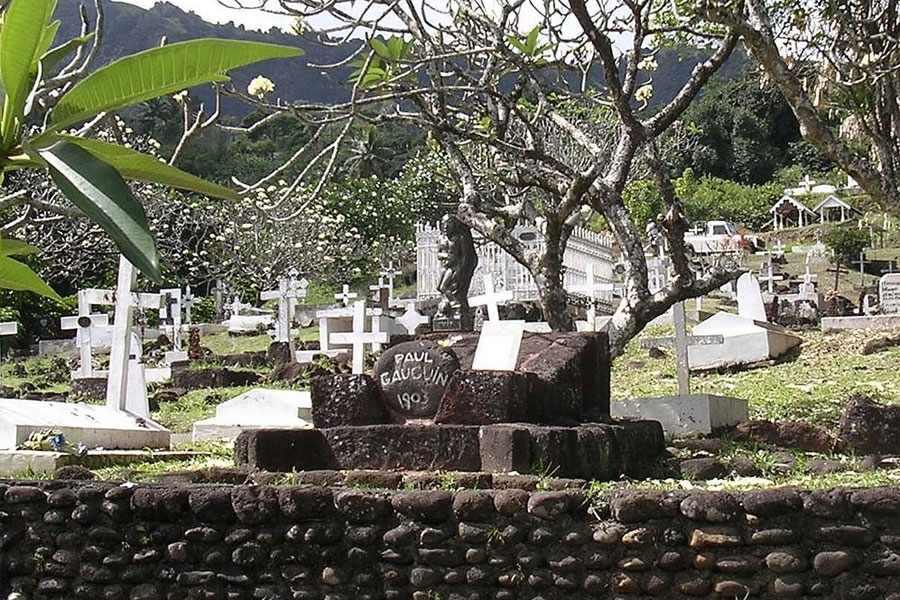 The largest of the southern islands, Hiva Oa, the master pillar or finial post of the ‘Great House’ - which represents the Marquesan archipelago in the local mythology - has always been the rival of Nuku Hiva. The island is shaped like a seahorse and has a mountain range running southwest to northeast whose main peaks, Mt. Temetiu and Mt. Feani form a real wall around Atuona. Atuona, a peaceful little port at the head of the Taaoa Bay, also known as Traitors Bay, has emerged from obscurity due to having had the privilege of being the last resting place of Paul Gauguin and of the singer Jacques Brel. The tombs of these famous personalities are on the side of the Calvary cemetery looking out across the bay and are places of great pilgrimage. In the village, the Gauguin Museum displays items related to the painter's stay there at the beginning of the century and has copies of his works.