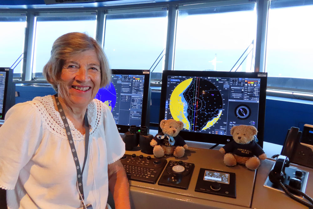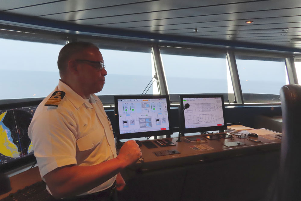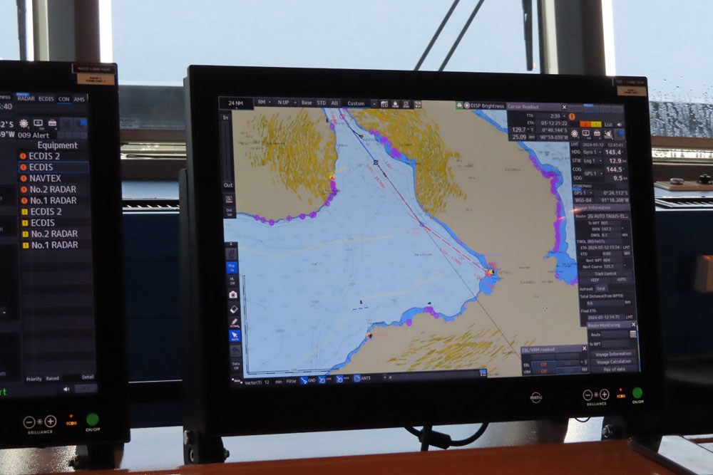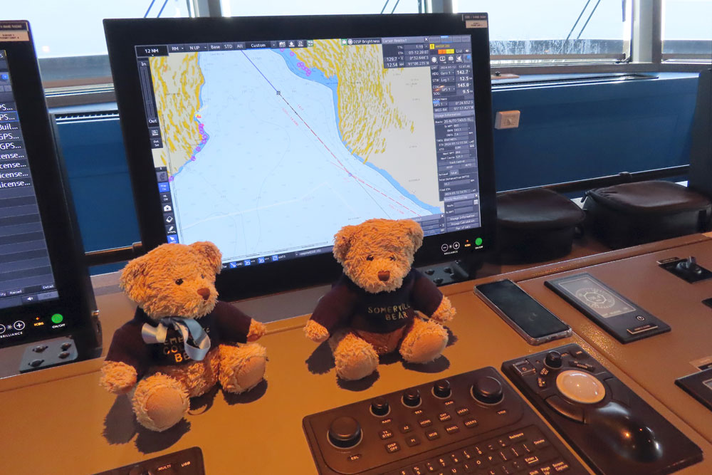 Once back we whiled the morning away until 12.30, when we went up to the bridge for a presentation there by the captain to about eight of us, then into lunch .