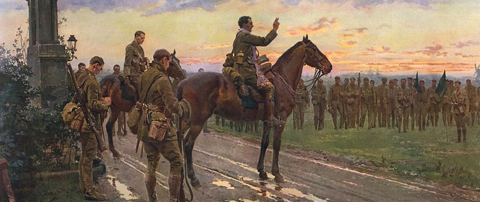 A painting long presumed lost – depicts soldiers of the Royal Munster Fusiliers regiment receiving “general absolution” from their chaplain on the eve of battle in May 1915. Most of them died within 24 hours. The painting, by Italian-born war artist Fortunino Matania, became one of the most famous images of the war when prints of it were published in illustrated weekly newspapers. Copies hung in houses & pubs throughout Ireland, and especially Munster, but, as Irish public opinion towards the war changed, the picture gradually disappeared from view.A copy still hangs in the famous pub Larkins of Garrykennedy Co Tipperary to this day.