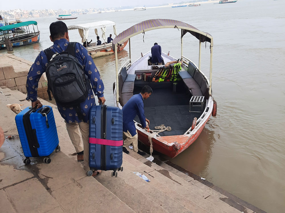 At this point our guide Muki left us, he returning to Bodhgaya by train, whilst we continued on to Varanasi with the driver. We arrived at Varanasi not long after 14.00 and we stopped in a busy street in the old town, where we were warmly greeted by four hotel staff and led through narrow, if somewhat fly ridden, alleyways for about 10 minutes, seeing two jumping monkeys en route, to arrive at to some ghats overlooking the Ganges. Here the hotel ferry awaited us and we were given a welcome drink aboard it and then sailed upstream for about 800 yards until we came to the hotel. It was a very impressive palace dating from 1810. Brijrama Palace had taken nine years of conversion in the early 2000s to become a 32 room hotel, the inside was truly wondrous, as indeed was the exterior overlooking the Ganges. We were shown to room 106 which we soon discovered had no view other than onto a wall and some green, plastic coated, air conditioning units.
