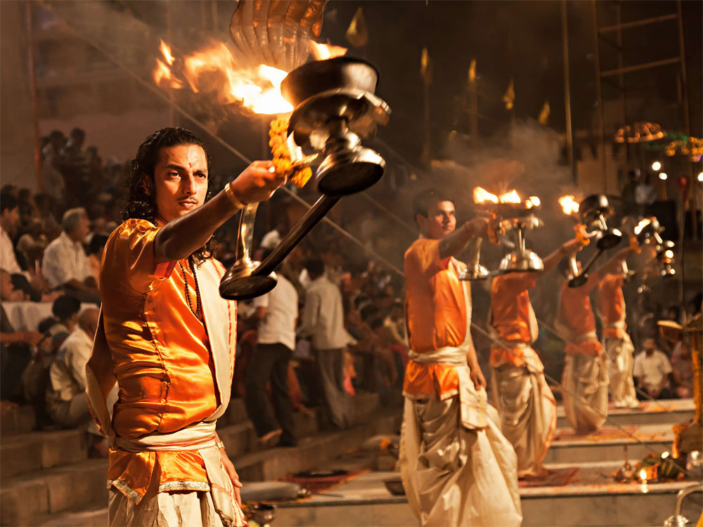 And every night the blessing of the Ganges ceremony takes place. The Ganga Aarti ceremony is a nightly ritual of worship to the Ganges River, and takes place every evening at sunset at Dashashwamedh Ghat. During this spiritual and visually captivating event, a group of priests performs a choreographed ceremony with chanting, fire offerings, and the waving of oil lamps to honour the river.