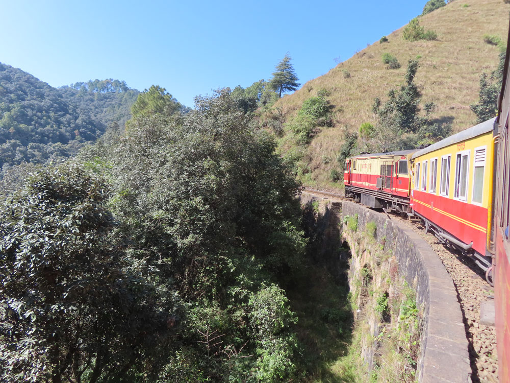 We boarded the 10.55 train and was shown to 2 tiny seats in a very crowded carriage. The windows were so dirty that we could not see out of them. We sat there wondering what was happening as the guide had disappeared . Anyway he eventually got back on the train as it departed. David told him that he wanted to get off at the first possible station and have the car meet us there: both of us had considered this mountain railway as a climax of our holiday and this was certainly not what we have been expecting. Anyway, the guide said that he would have a word to the ticket collector and see if there was any chance of getting into a tourist carriage where there would be more space. This he achieved and after about 45 minutes we struggled to exit our original carriage, as it was cluttered by large suitcases in the corridors as well as all the people, and we were shown into another carriage where there was plenty of legroom and we could have the windows open more, although this was still far from perfect as the glass had completely deteriorated so half the window was opaque. But the scenery was very spectacular and on the whole we enjoyed the experience. We alighted at Kandarghat after two hours on the train and were met by our car.