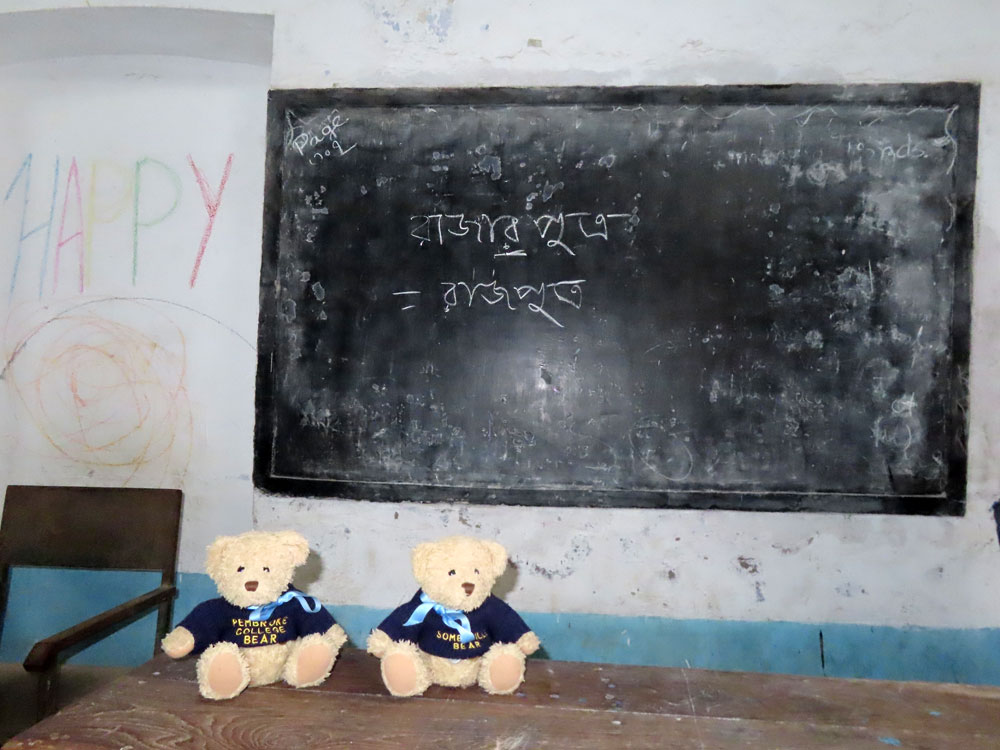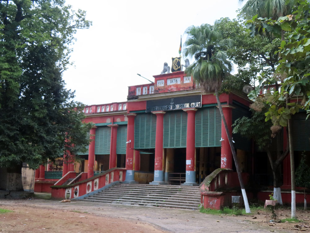 Sailing up the Hoogley river. After a so so breakfast on the ship, we went ashore at 10 am and walked round .Chandernagore, a part of the French colony in Bengal. passed the museum along the road beside the river, but this was shut and we eventually got to the present day courthouse, once the hotel de Paris, the town hall. This was in a really bad condition and we also saw where the lawyers would talk to their clients which was really antiquated: As it was a holiday the court was not sitting but there were people there typing away on old fashioned typewriters. An awful lot of money would be needed to be spent to bring this majestic building into a suitable state for preservation. We visited a French Catholic Church. After this we walked beside the river until we got back to the ghat where Pandaw’s boat was waiting for us, passing cows on the pavement en route.