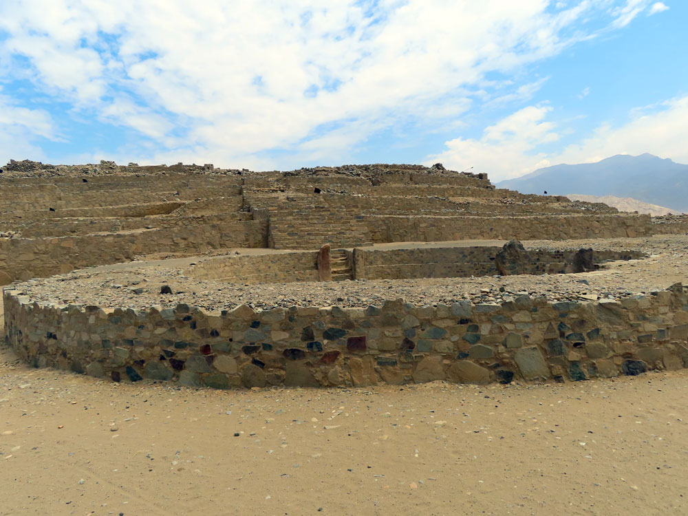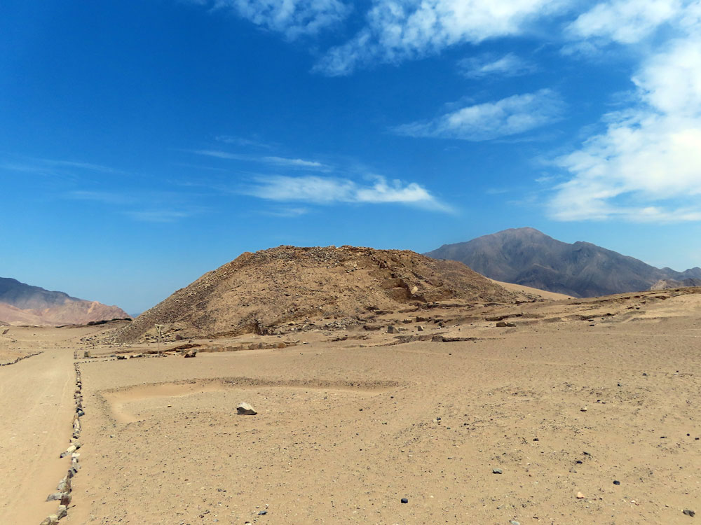 Saturday, January 4 Lima to Huaraz We got up at 5:15 and left the ship before 5.45 and located our luggage waiting for us on the quay. Although we had to battle a horde of porters who wanted to carry it foot the next few yards. We then had great difficulty finding the shuttle bus and was assured by someone that there was not a shuttle. But in the end we found it. Interestingly the 6 o’clock shuttle bus left at 5:50 with just four of us aboard. This went to the Plaza San Rosa and here we found after a few minutes our car and driver, Felix. Our guide, Dante arrived a few minutes later and we headed north out of Lima. It took some time to clear the favelas of the city, but then we were out into the desert. We stopped at a petrol station for a restrooms and then carried on for another hour or so arriving soon after 10:30 am at the archeological site of Caral.