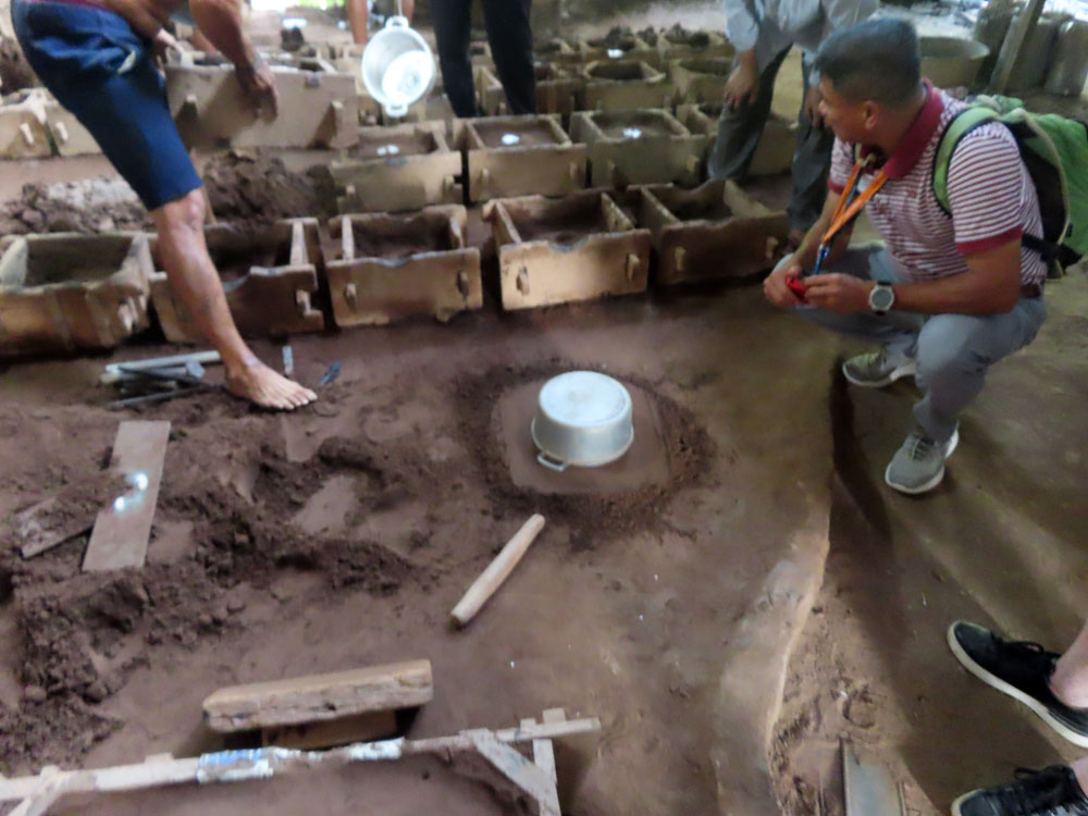 A steep bank to climb up to get to a village. Then we got into tuc tucs to go to an aluminium smelting process in someone’s house , where originally they had used ordinance from the Vietnam war but now we are using aluminium cans and aluminium recycled from houses. It was a very basic operation and health and safety standards did not exist. We saw how they made the moulds for pots, pans and other articles out of sand and then poured the molten aluminium in them. It was very basic and at the same time very impressive and highly skilled